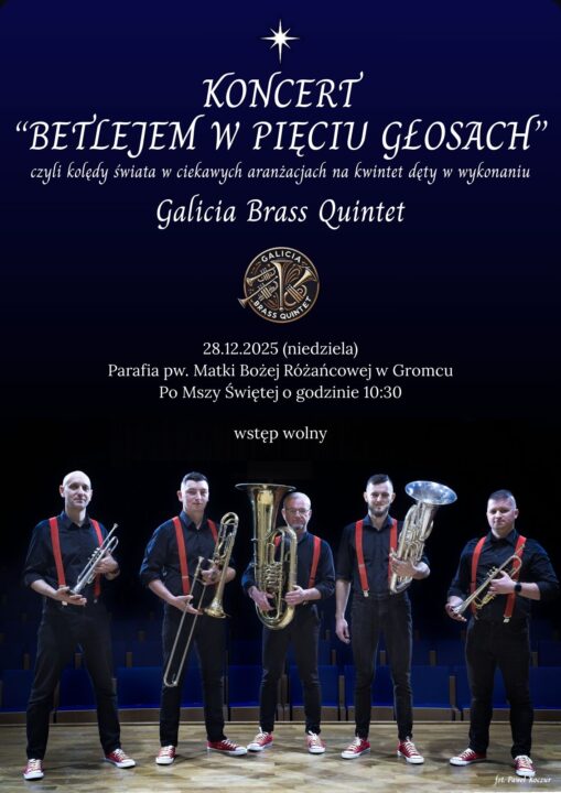 W niedzielę 28 grudnia 2025 r. po Mszy św. o godzinie 10.30 zapraszamy na koncert kolęd pod tytułem „Betlejem w pięciu głosach”. Zespół „Galicia Brass Quintet” zabierze nas w podróż przez różne kraje, tradycje i style – od średniowiecznej łaciny, przez polskie, francuskie, brytyjskie czy skandynawskie kolędy, aż po współczesne amerykańskie utwory. Wszystkie utwory usłyszymy w nowych, specjalnie na tę okazję przygotowanych aranżacjach na kwintet blaszany.